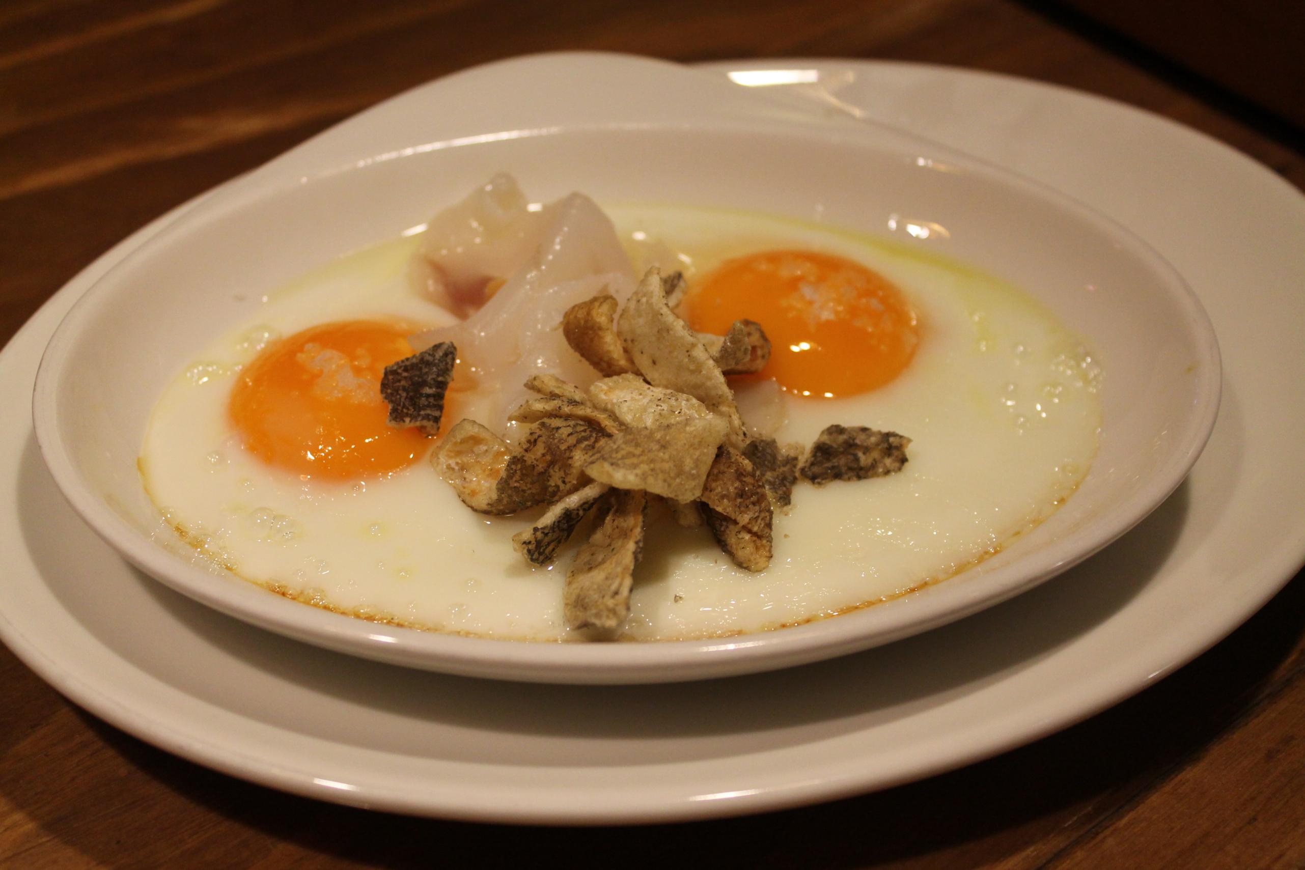 Ésta es su tierra. Nació y se crió en el País Vasco. En carta no podían faltar el Txakolí y los huevos con bacalao. Euskadi en estado puro. El viaje de su niñez, de su adolescencia, de su madurez. Qué mejor viaje que el del día a día, el del paso a paso, el de sus pinitos en la cocina. Un plato para homenajear a su familia, una oportunidad para que la Barceloneta sepa un poquito a Hondarribia desde los escasos de diez metros cuadrados en los que ha invertido sueños.